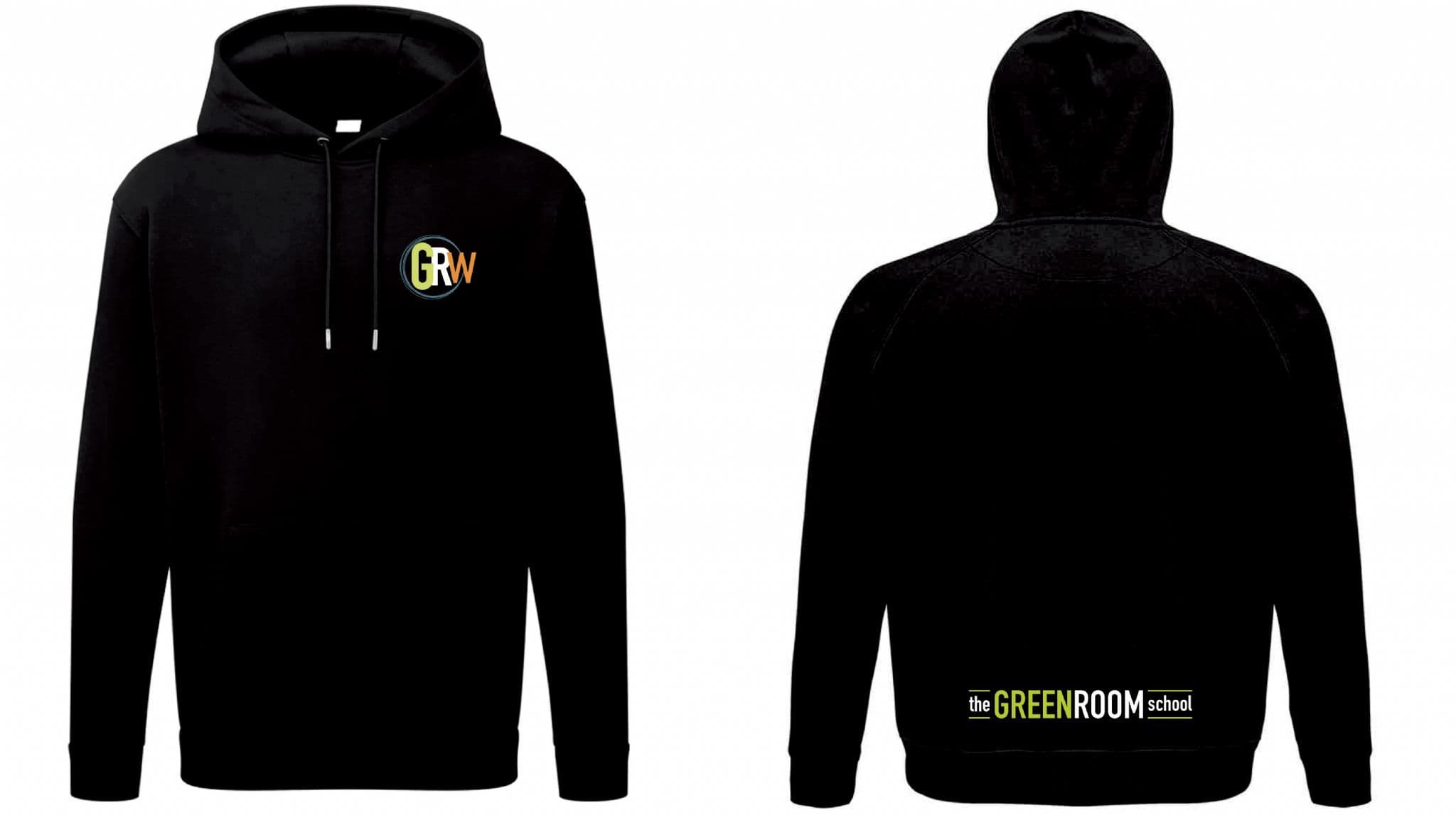 The Green Room Organic Hoodie with printed left breast and lower back design.